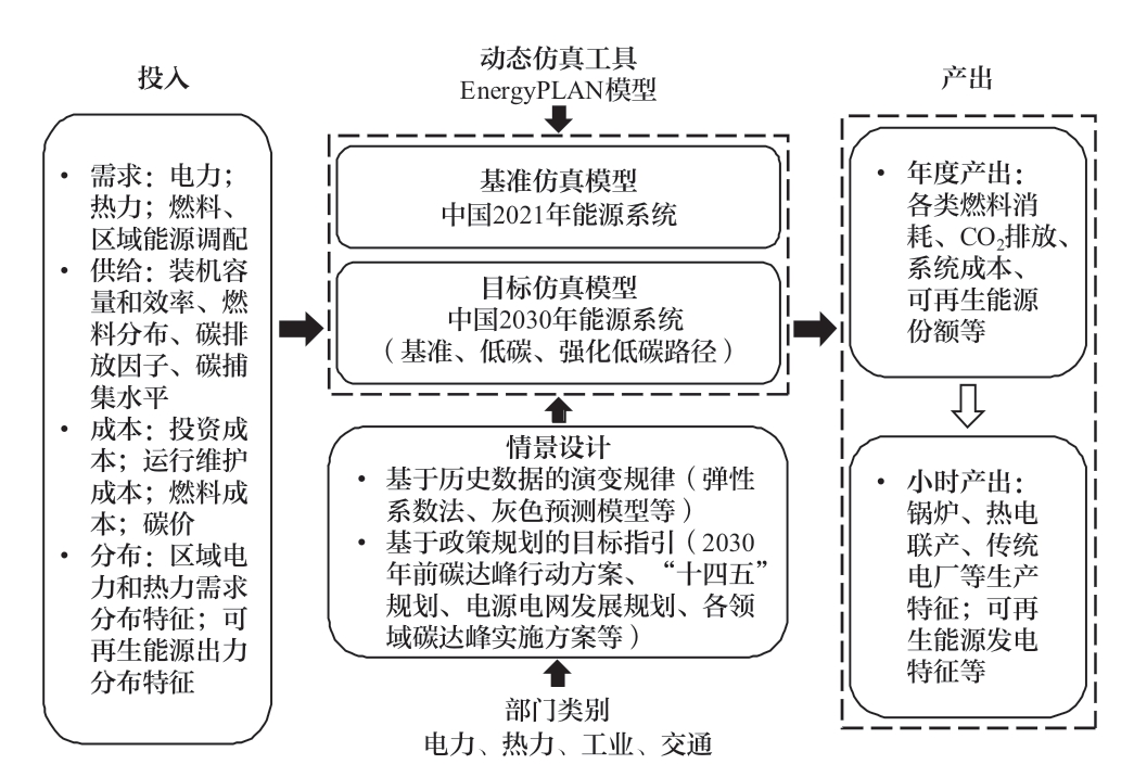 基于此,本研究结合EnergyPLAN先进规划模型构建统筹电力、热力、工业、交通4大部门的能源系统仿真模型,在碳达峰目标下兼顾历史规律客观性和发展规划前瞻性,科学设定能源系统转型的基准路径、低碳路径和强化低碳路径,并通过数值模拟研判系统转型的季节异质性、部门异质性和成本异质性,以能源系统率先脱碳助力碳达峰目标“先立后破”。