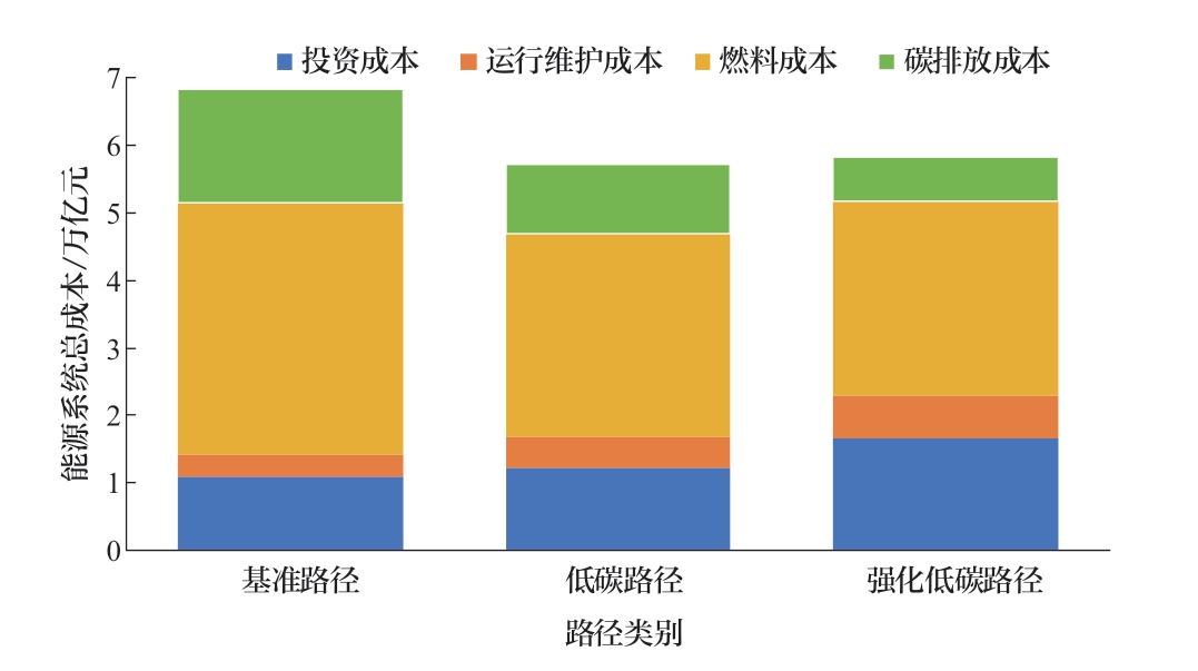 能源系统涵盖投资、运行维护、燃料、碳排放等多维成本要素。经济可行性是能源系统低碳转型的重要前提,不同路径下系统总成本及其构成见图7。