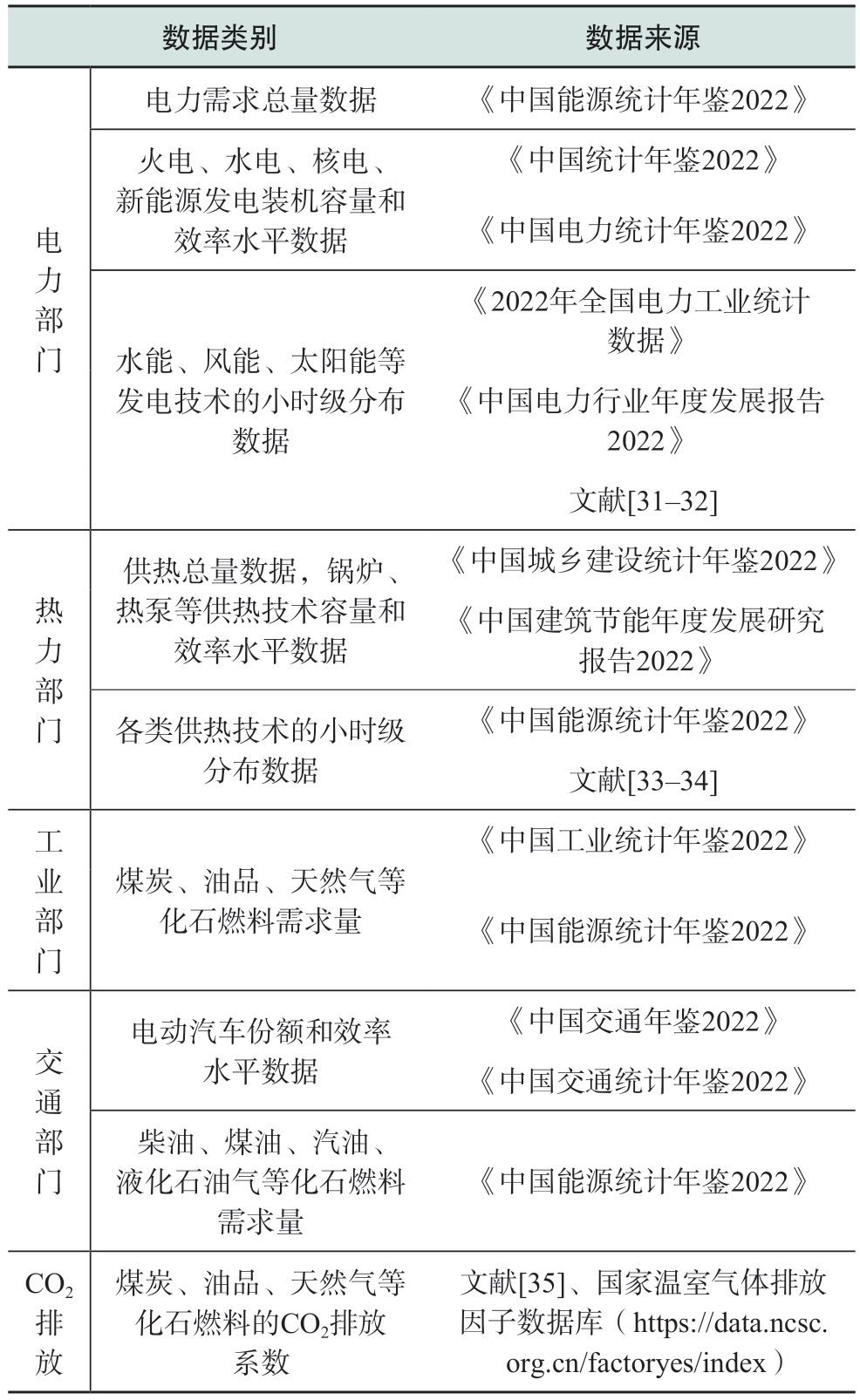 数据类别 数据来源电力部门电力需求总量数据 《中国能源统计年鉴2022》火电、水电、核电、新能源发电装机容量和效率水平数据《中国统计年鉴2022》《中国电力统计年鉴2022》水能、风能、太阳能等发电技术的小时级分布数据《2022年全国电力工业统计数据》《中国电力行业年度发展报告2022》文献[31–32]热力部门《中国城乡建设统计年鉴2022》《中国建筑节能年度发展研究报告2022》各类供热技术的小时级分布数据供热总量数据,锅炉、热泵等供热技术容量和效率水平数据《中国能源统计年鉴2022》文献[33–34]工业部门《中国工业统计年鉴2022》煤炭、油品、天然气等化石燃料需求量《中国能源统计年鉴2022》交通部门电动汽车份额和效率水平数据《中国交通年鉴2022》《中国交通统计年鉴2022》柴油、煤油、汽油、液化石油气等化石燃料需求量《中国能源统计年鉴2022》CO2排放煤炭、油品、天然气等化石燃料的CO2排放系数文献[35]、国家温室气体排放因子数据库(https://data.ncsc.org.cn/factoryes/index)