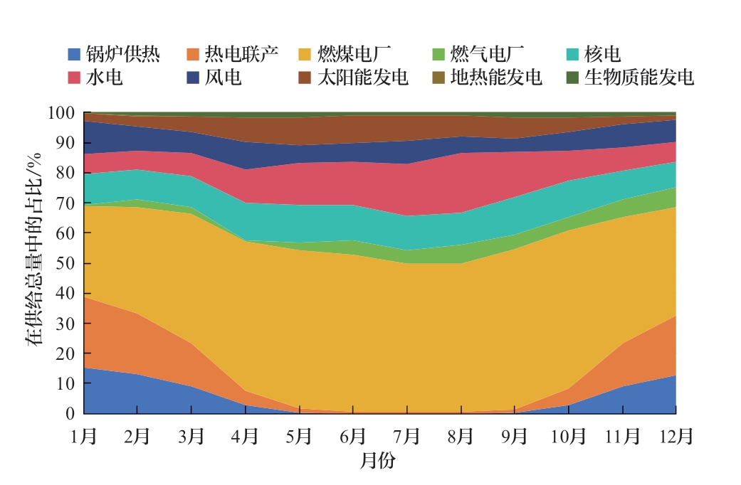 1)中国能源系统供能特征呈现季节异质性。在供暖需求激励下冬季锅炉供热和CHP占比较大,且在蒙古-西伯利亚高压、低温、日照等影响下风电占比最大、水电次之、太阳能发电最小;夏季进入丰水期且太阳能丰沛,但可能诱发过剩电力生产;春季随着气温回升,锅炉供热和CHP逐步被燃煤电厂替代;秋季风电出力下降,而水电和太阳能发电呈上升趋势。核电由于具备资源消耗量小、长期大规模稳定供给等优势故得以发展,而生物质能和地热能发电出力贡献有待提升。