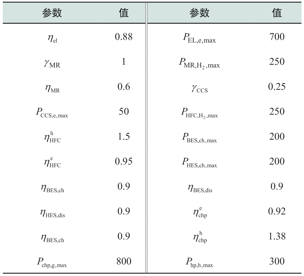 而本文构建的PCH联合模型通过将二氧化碳转化为天然气的方式实现碳减排,因此在一定程度上能够降低综合能源系统中的碳排放。在PCH联合模型中,CCS设备的固碳功率与PCH模型的碳减排直接相关,风电、光伏等可再生能源发电以及上级电网将供应PCH联合模型的电能需求,而可再生能源的碳排放忽略不计。综合能源系统的碳排放模型表达式如下: