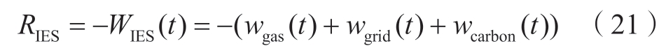 式中:E IES( t)为t时刻I E S系统具有碳排放配额;E e (t )、E g(t )分别为t时刻IES系统购买电能与CHP设备燃烧天然气所具有的碳排放配额;τ e、τ g分别为电与天然气的碳配额系数。
