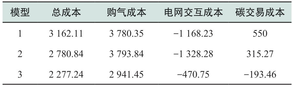 在表5中,如果电网交互成本为负值,表明系统通过售电获得收益,相应地,如果碳交易成本为负值,表明系统通过出售碳排放权获得收益。由此可知:相比于模型1,模型2在具有相同的购气成本基础上,能够通过提高向电网售电量以增加收益,即通过降低购电量来降低碳排放和总成本。由于模型1所采用的传统碳交易机制具有局限性,无法体现在碳交易区间内的成本差异,因此其碳交易成本较高,高达550元。因此,改进碳交易机制的设置能够使碳交易成本与实际更加贴合,更能从整体上降低总成本。但由于缺乏减碳模型的设置,模型1与2均无法通过售卖碳交易权获得收益。