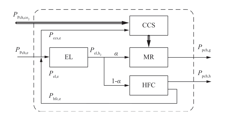 根据上述对P2G、CCS、HFC三者之间的耦合关系进而将其重构为PCH联合模型,其输入为电能Pp ch,e(t )与碳排放量Pp ch,co2(t ),其输出为天然气Pp ch,g( t)与热能Pp ch,h(t ),氢能转换的中间环节中设置氢能分配率α来平衡天然气与热能的输出关系。