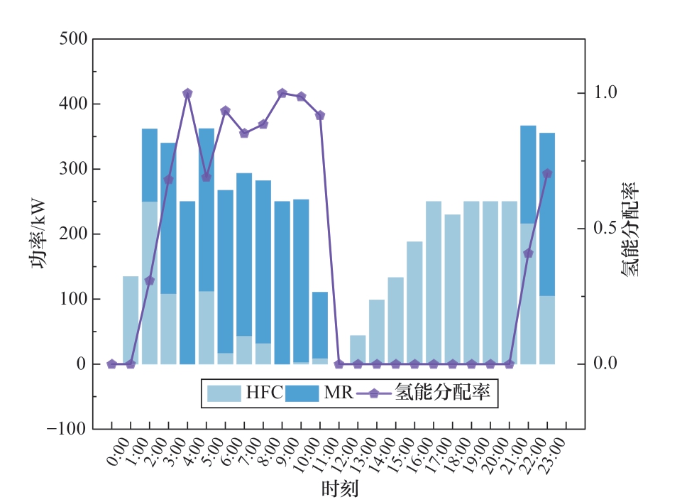1) 在3:00—11:00、22:00—23:00的调度区间中,主要供能设备为风电与CHP机组,在满足较低的电、热负荷需求的基础上综合能源系统仍然具有丰富的电能供应,因此智能体的动作策略引导PCH联合模型利用电能并以较高的氢能分配率来提升固碳能力,并供应系统天然气需求。
