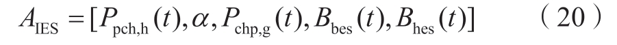 状态空间将根据其需要的IES环境状态信息而设定。因此需要考虑4个部分:①随机性数据集合sr,表示具有随机性的电负荷需求、热负荷需求、气负荷需求、光伏与风机的电功率;②设备运行状态集合sg,表示前一时刻设备的电能、热能供应的设备信息包括PCH的热能供应、CHP的电能和热能供应以及储能设备 (BES、HES) 的储能容量;③能源价格数据集合sε,表示实时的能源价格包括电能购价和售价以及气能价格;④当前时刻t。由这4个部分共同构成智能体需要观测的状态空间,可表示为: