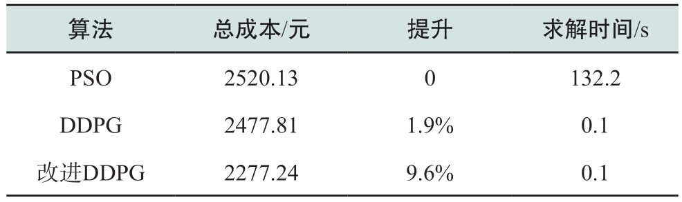 由表可知,本文所提改进DDPG算法与传统启发式算法相比,降低了9.6%的目标总成本,同时在求解速度上具有明显的提升,一方面是因为传统启发式算法容易陷入局部最优解,另一方面是因为训练好的DDPG智能体能够避免重新的迭代求解所需的探索时间,可以在较短时间内给出最优解。与传统DDPG相比,经济总成本更低,是因为混合噪声机制的设置,使其能探索到更适应的策略动作。