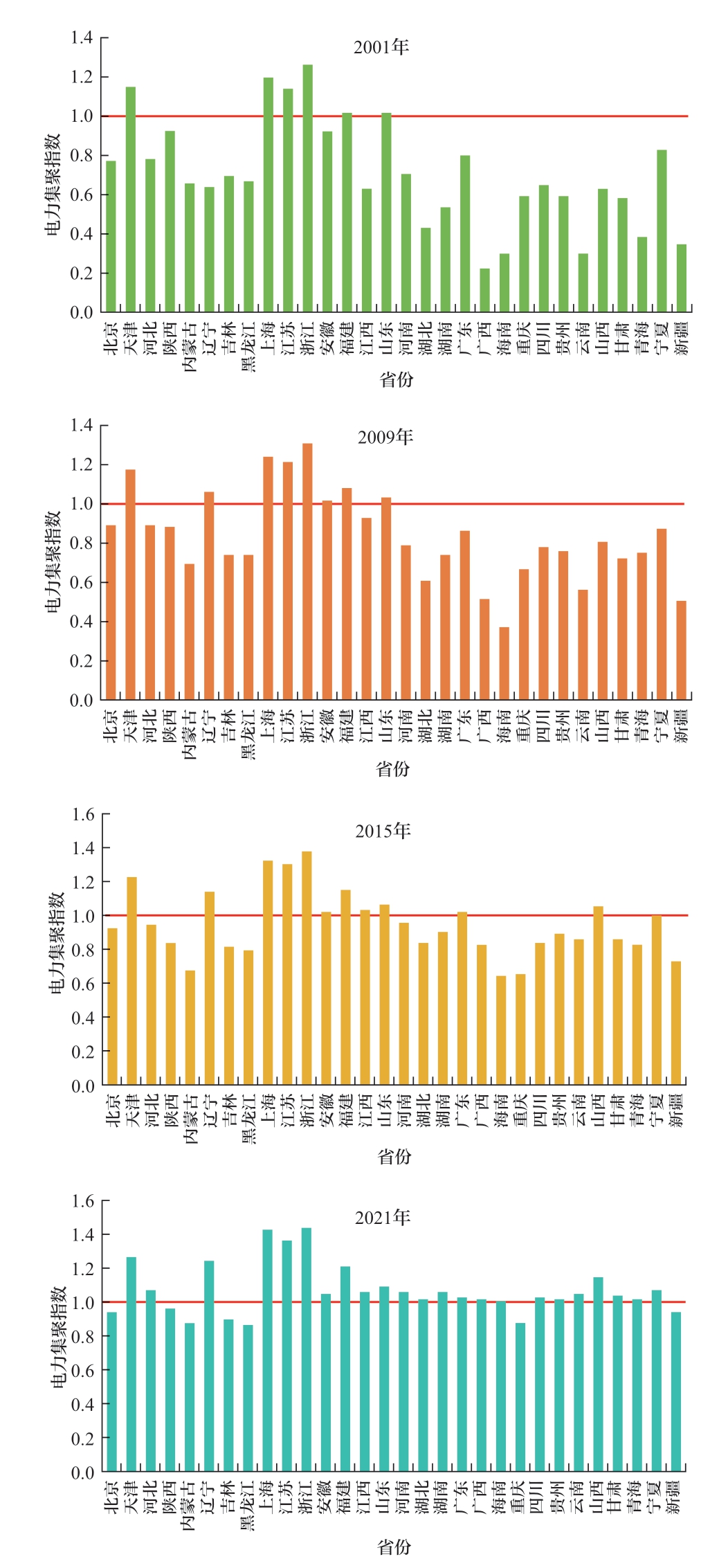 除分析计算2021年中国各地区电力集聚水平外,本文额外选取2001年、2009年(全球经济危机)、2015年(新一轮电力体制改革)及2021年各地区电力集聚水平进行分析,具体如图2所示。可以看出,2001年30个地区电力集聚指数超过1的有6个地区,2009年有8个,2015年有12个,2021年有23个,呈现电力集聚的地区范围愈发广泛,且各地区的电力集聚指数也呈现稳步上升趋势。