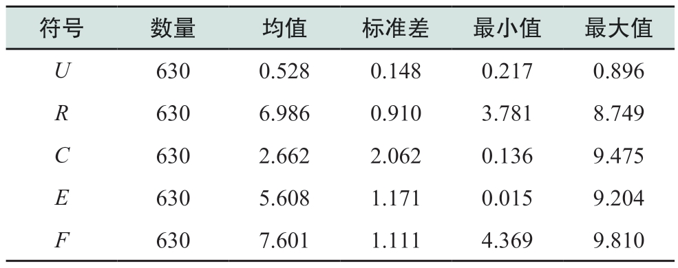 符号 数量 均值 标准差 最小值 最大值U 630 0.528 0.148 0.217 0.896 R 630 6.986 0.910 3.781 8.749 C 630 2.662 2.062 0.136 9.475 E 630 5.608 1.171 0.015 9.204 F 630 7.601 1.111 4.369 9.810