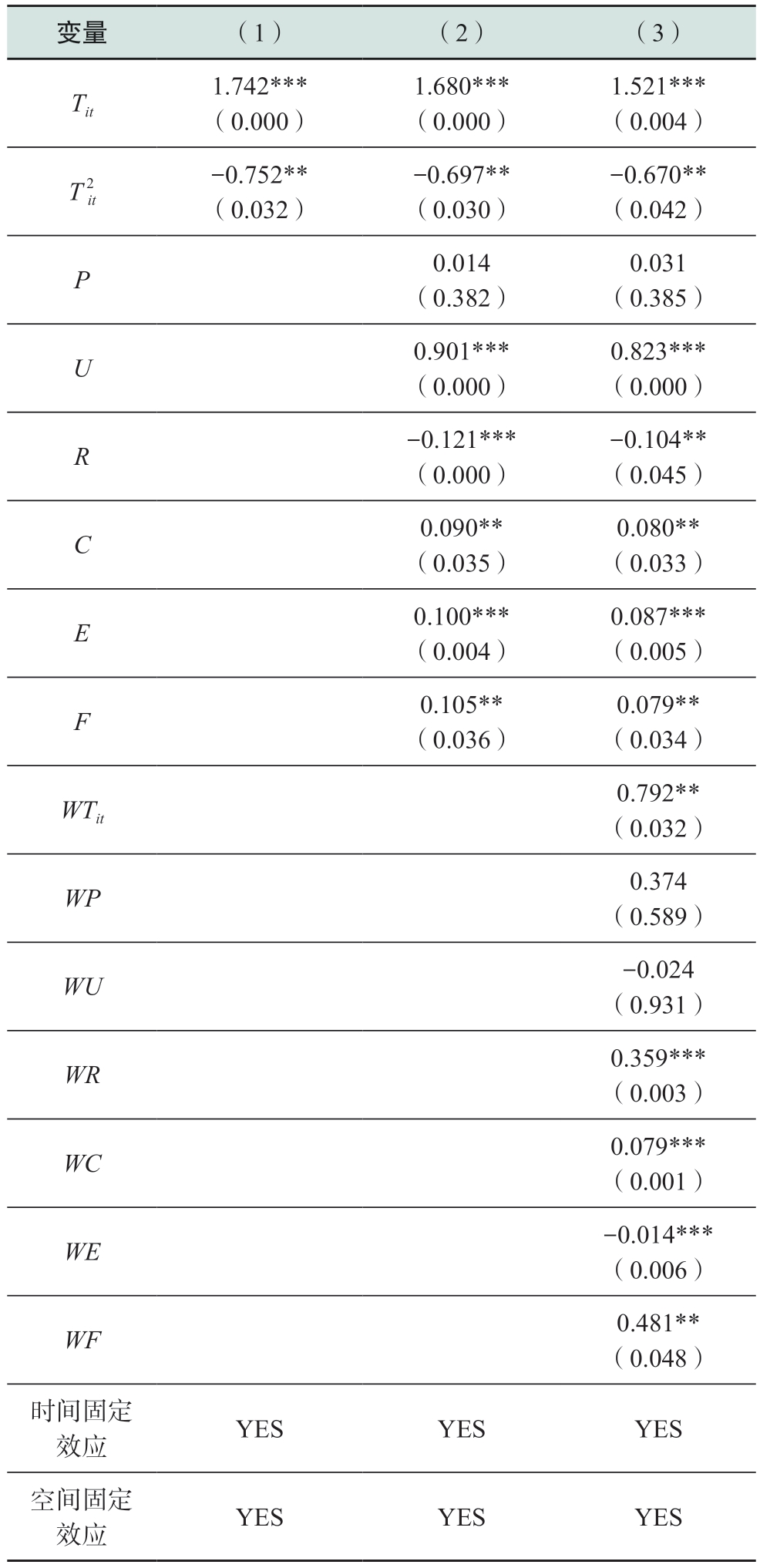 可以看出,第一,4个LM检验统计量(LM-lag/err和Robust LM-lag/err)均在5%水平上显著,表明选择空间计量模型处理该数据具有合理性;第二,Hausman检验统计量在1%水平上显著,表明应当采用固定效应模型进行相关分析;第三,2个LR检验统计量(LR-SDM/SAR和LR-SDM/SEM)均在1%水平上显著,强烈拒绝原假设,表明SDM模型不能退化为SAR模型或SEM模型;第四,LR时间-空间效应检验均在1%水平上拒绝原假设,表明选择SDM模型时,采用时间-空间双固定效应模型更有效。