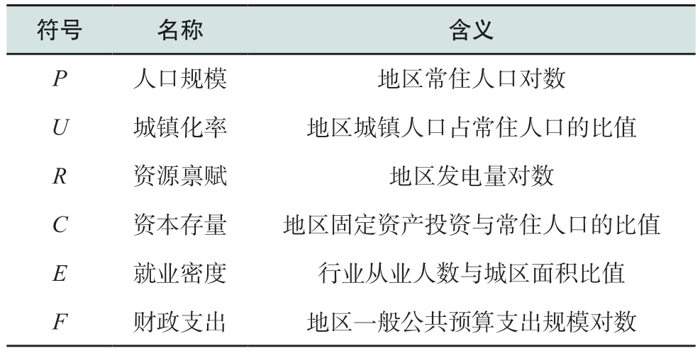 符号 名称 含义P 人口规模 地区常住人口对数U 城镇化率 地区城镇人口占常住人口的比值R 资源禀赋 地区发电量对数C 资本存量 地区固定资产投资与常住人口的比值E 就业密度 行业从业人数与城区面积比值F 财政支出 地区一般公共预算支出规模对数