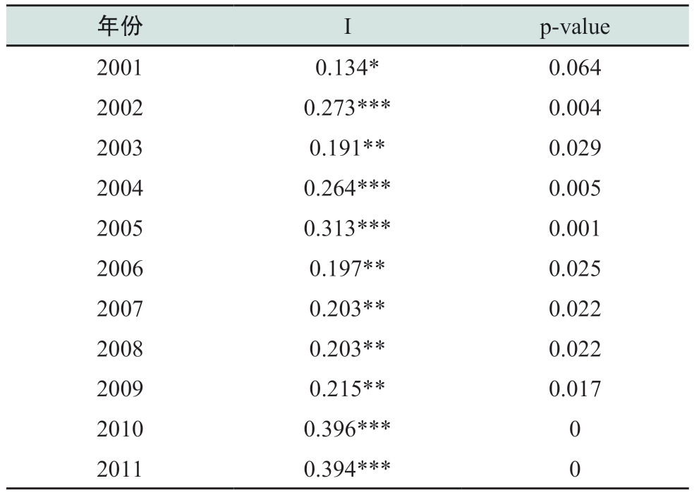 年份 I p-value 2001 0.134* 0.064 2002 0.273*** 0.004 2003 0.191** 0.029 2004 0.264*** 0.005 2005 0.313*** 0.001 2006 0.197** 0.025 2007 0.203** 0.022 2008 0.203** 0.022 2009 0.215** 0.017 2010 0.396*** 0 2011 0.394*** 0