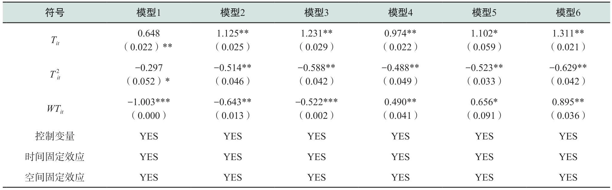 式中:i表示不同地区;t表示年份;j表示与i相邻的地区;Yit是地区各个年份的能源转型衡量指标;Tit是各地区各年份的电力集聚水平;Xit是一系列控制变量;Wi,j是地区空间权重矩阵,鉴于电力传输的跨地区性,本模型构建原则与集聚水平测度部分略有不同,构造原则为根据各个地区电力传输线路直接相连情况,设置二进制连接矩阵;ci表示空间特定效应(spatial specific effects);μt表示时间特定效应 (time period specific effects);εi ,t为服从独立分布的随机误差项,其取值为(0,σ 2);α、ρ、θ均为待估参数。