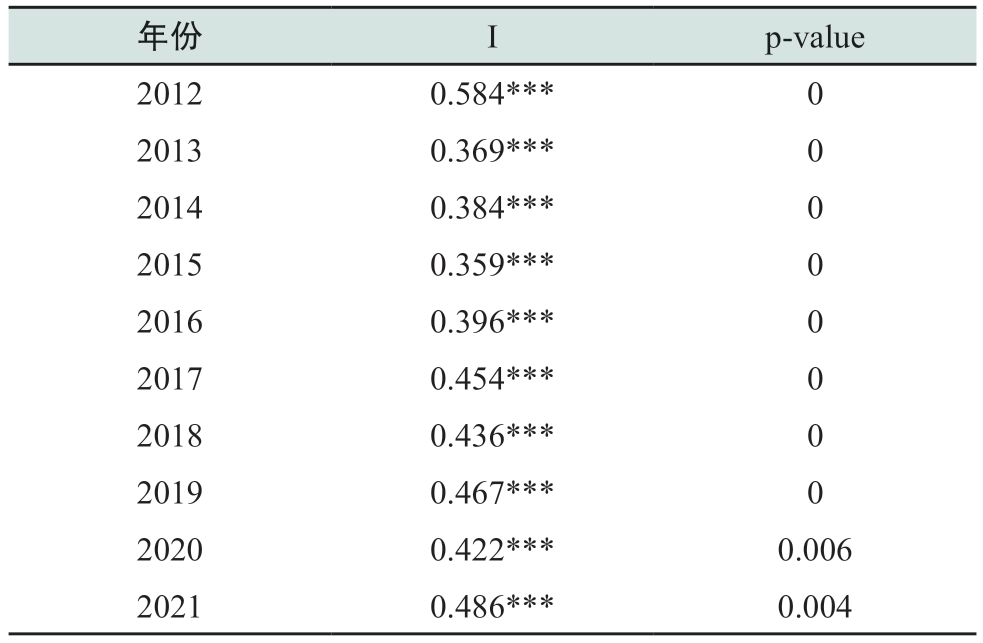 年份 I p-value 2012 0.584*** 0 2013 0.369*** 0 2014 0.384*** 0 2015 0.359*** 0 2016 0.396*** 0 2017 0.454*** 0 2018 0.436*** 0 2019 0.467*** 0 2020 0.422*** 0.006 2021 0.486*** 0.004