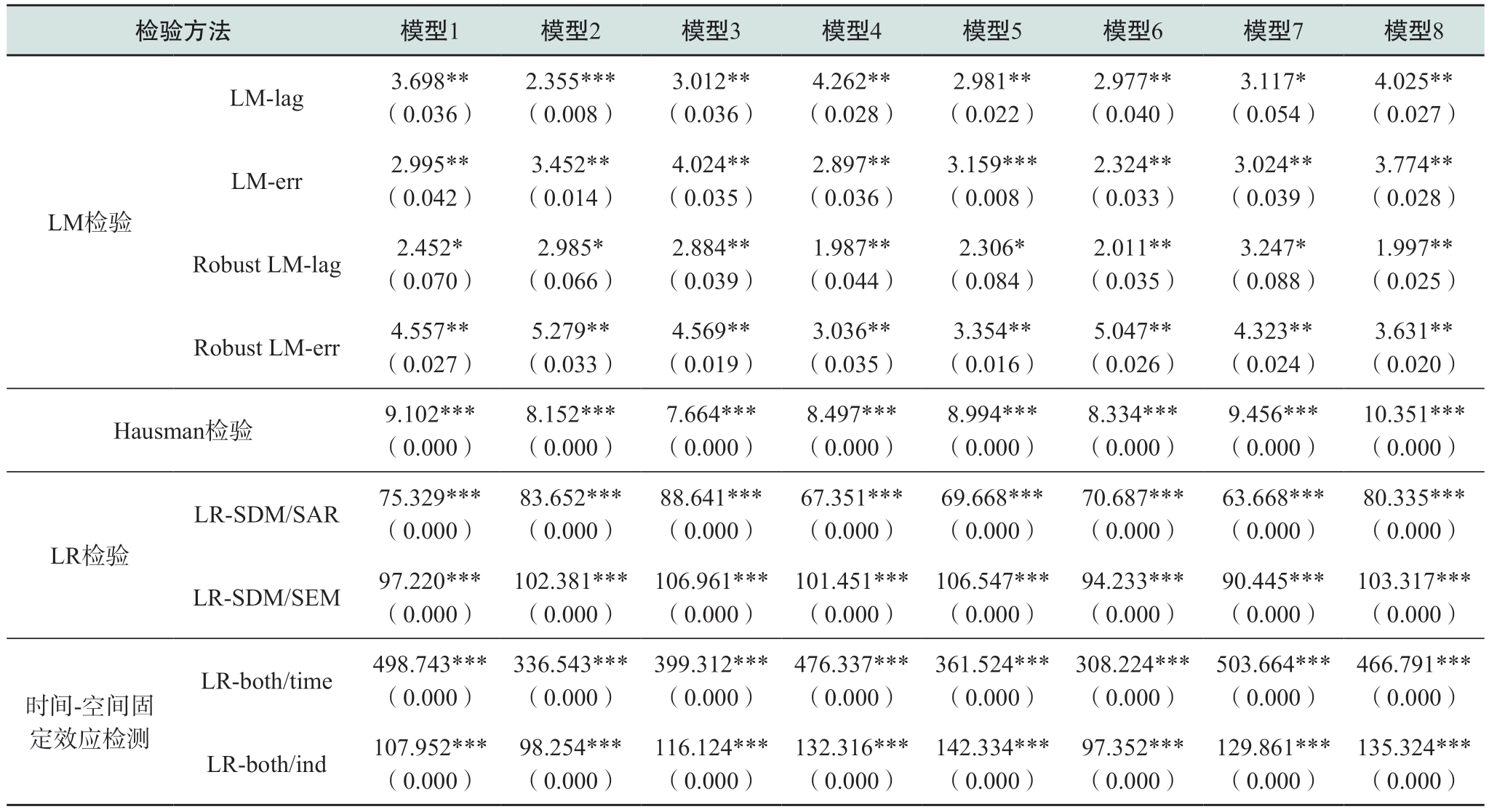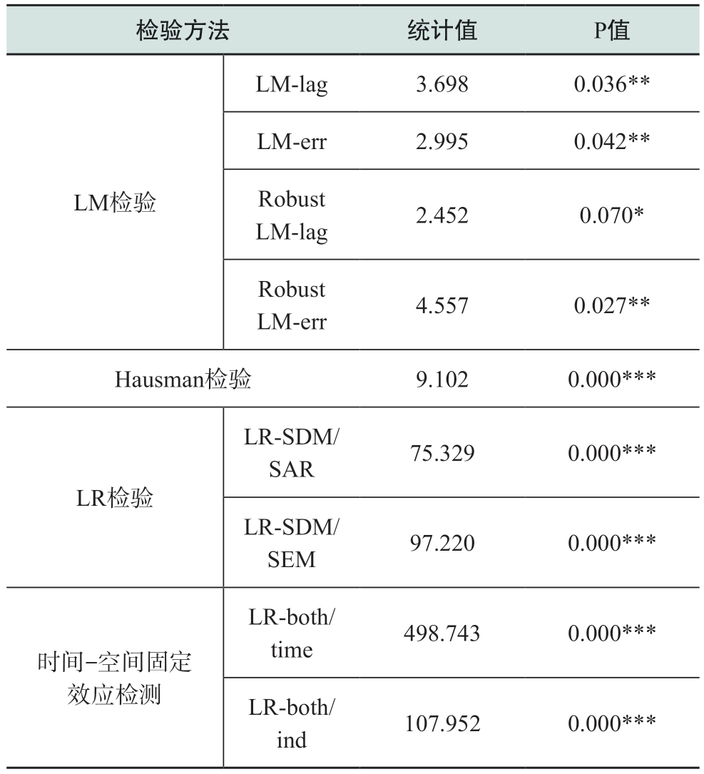 检验方法 统计值 P值LM-lag 3.698 0.036**LM-err 2.995 0.042**LM检验Robust LM-lag 2.452 0.070*Robust LM-err 4.557 0.027**Hausman检验 9.102 0.000***LR-SDM/SAR 75.329 0.000***LR检验LR-SDM/SEM 97.220 0.000***时间-空间固定效应检测LR-both/time 498.743 0.000***LR-both/ind 107.952 0.000***