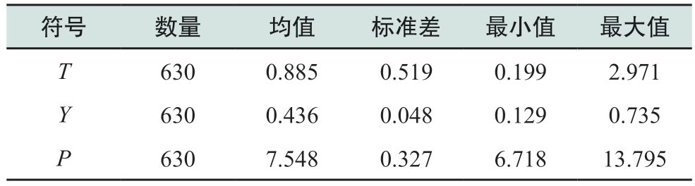 符号 数量 均值 标准差 最小值 最大值T 630 0.885 0.519 0.199 2.971 Y 630 0.436 0.048 0.129 0.735 P 630 7.548 0.327 6.718 13.795