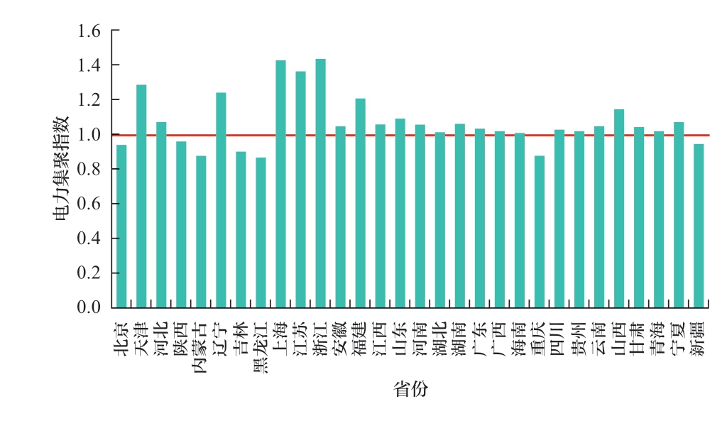 根据计算式(2),本文计算了2001—2021年大陆30个省、自治区、直辖市(西藏除外)的电力集聚指数,图1统计了2001—2021年各地区平均电力集聚指数。