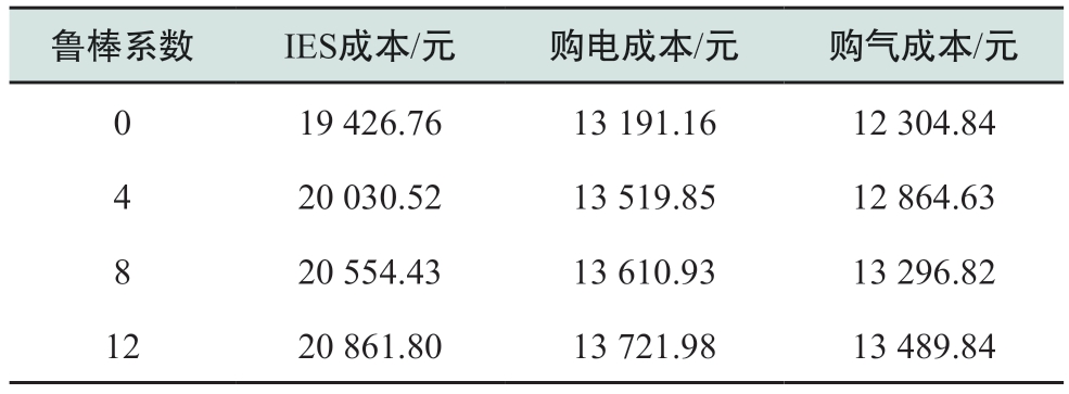 鲁棒系数 IES成本/元 购电成本/元 购气成本/元0 19 426.76 13 191.16 12 304.84 4 20 030.52 13 519.85 12 864.63 8 20 554.43 13 610.93 13 296.82 12 20 861.80 13 721.98 13 489.84