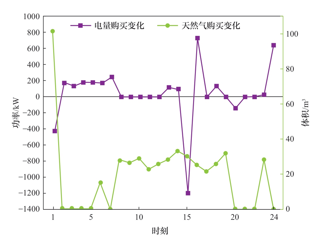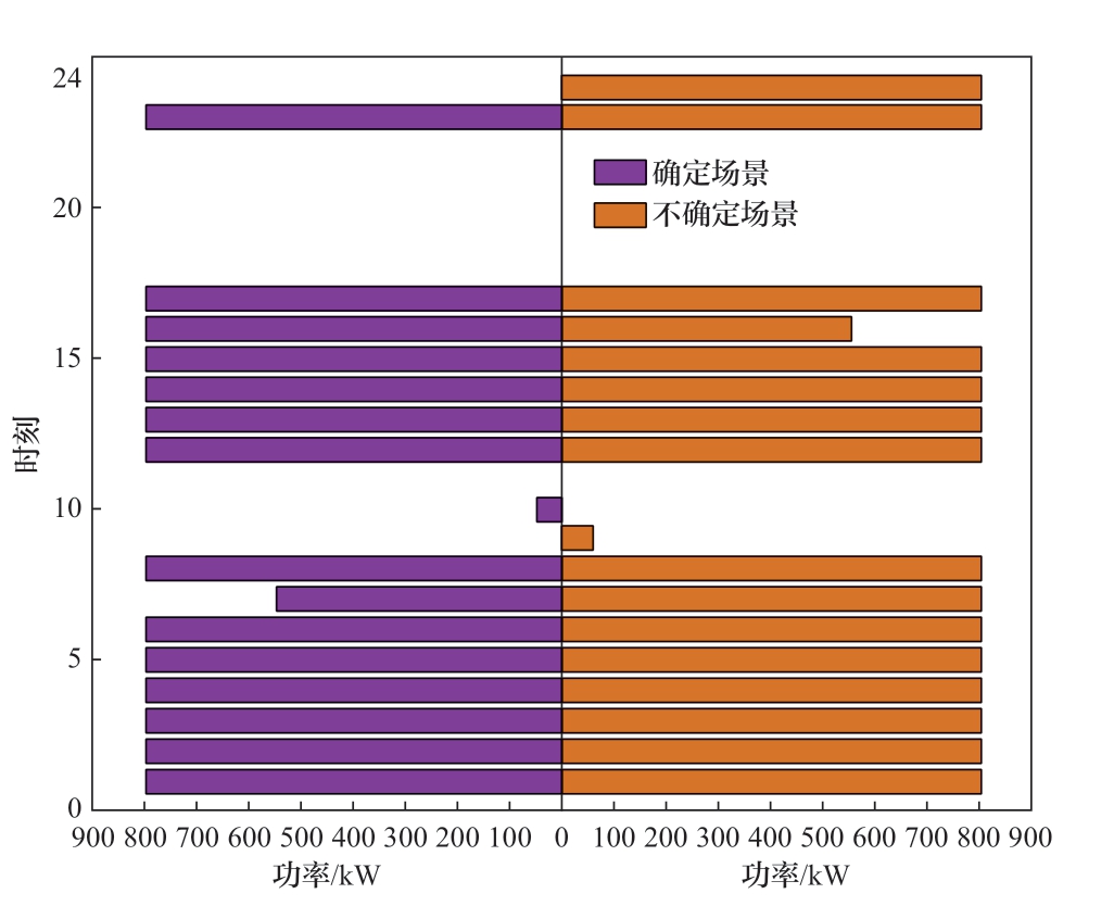确定性方案 考虑不确定性方案IES购电量/kW 27 640.24 28 728.27 IES购气量/m3 4 921.94 5 395.94 IES充电量/kW 3 839.11 3 945.25 IES放电量/kW 5 472.29 5 568.08 HRS购电量/kW 11 805.23 12 605.23 HRS净产氢/kg 370.46 395.16
