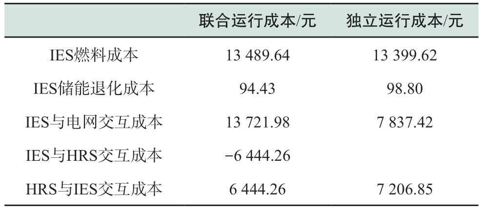 联合运行成本/元 独立运行成本/元IES燃料成本 13 489.64 13 399.62 IES储能退化成本 94.43 98.80 IES与电网交互成本 13 721.98 7 837.42 IES与HRS交互成本 -6 444.26 HRS与IES交互成本 6 444.26 7 206.85