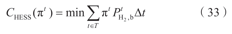 第二阶段(跟随者响应):HRS根据IES发布的价格信号,优化自身运营策略(如电能采购、氢气制备、存储、销售计划),并向IES反馈需求信息。在HRS运营中,氢气需求量的不确定性是核心挑战之一。为了精确刻画储氢罐内氢负荷的动态变化(如储氢量的实时波动、制氢与耗氢的平衡关系)及其与用户氢负荷需求之间的耦合作用,本文在HRS模型中嵌入储氢罐的动态模型。该模型通过描述储氢罐内氢负荷变化、制氢量、耗氢量以及用户需求的随机性,为系统优化提供物理基础,并且用户氢负荷的波动会影响购能成本。为此,需进一步将HRS的运营问题建模为分布鲁棒机会约束优化模型:在仅已知部分不确定性概率分布信息的条件下,通过设定风险容忍度,在保障系统可靠性的同时,最小化最坏情景下的预期购能成本。这一方法既避免了传统鲁棒优化过于保守的缺陷,又克服了随机规划对精确概率分布的依赖,从而在经济性与鲁棒性之间实现有效权衡。
