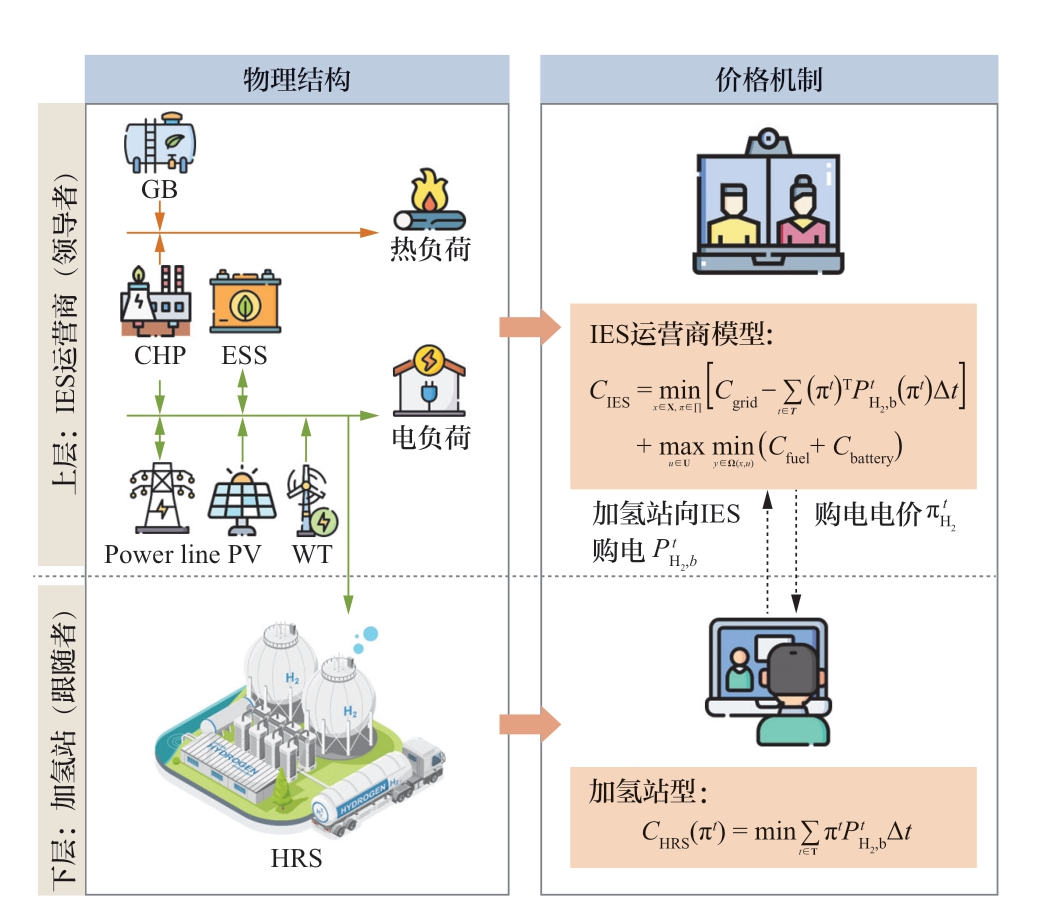 在IES – HRS联合运行的框架下, IES运营商作为领导者,优化向HRS的售电电价和系统调度计划,使得运营成本最小化;HRS作为电能需求侧的参与者,扮演跟随者角色,根据IES的价格信号,优化购能计划和运行计划,以实现最小化购能成本。博弈过程分为两阶段。