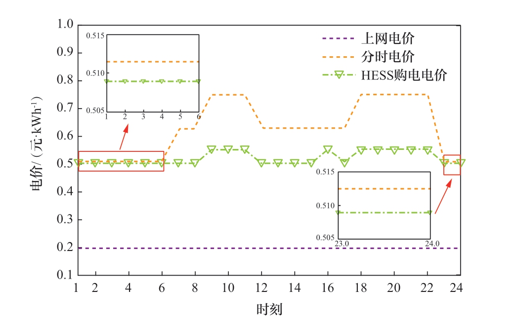 本文价格约束如式 (27) 所示。第一个约束定义了价格的上界和下界,以避免出现极值;第二个约束定义了平均价格不应超过电网分时电价的平均值,使得IES具有市场竞争力。