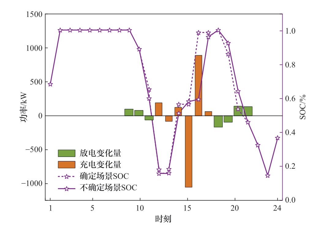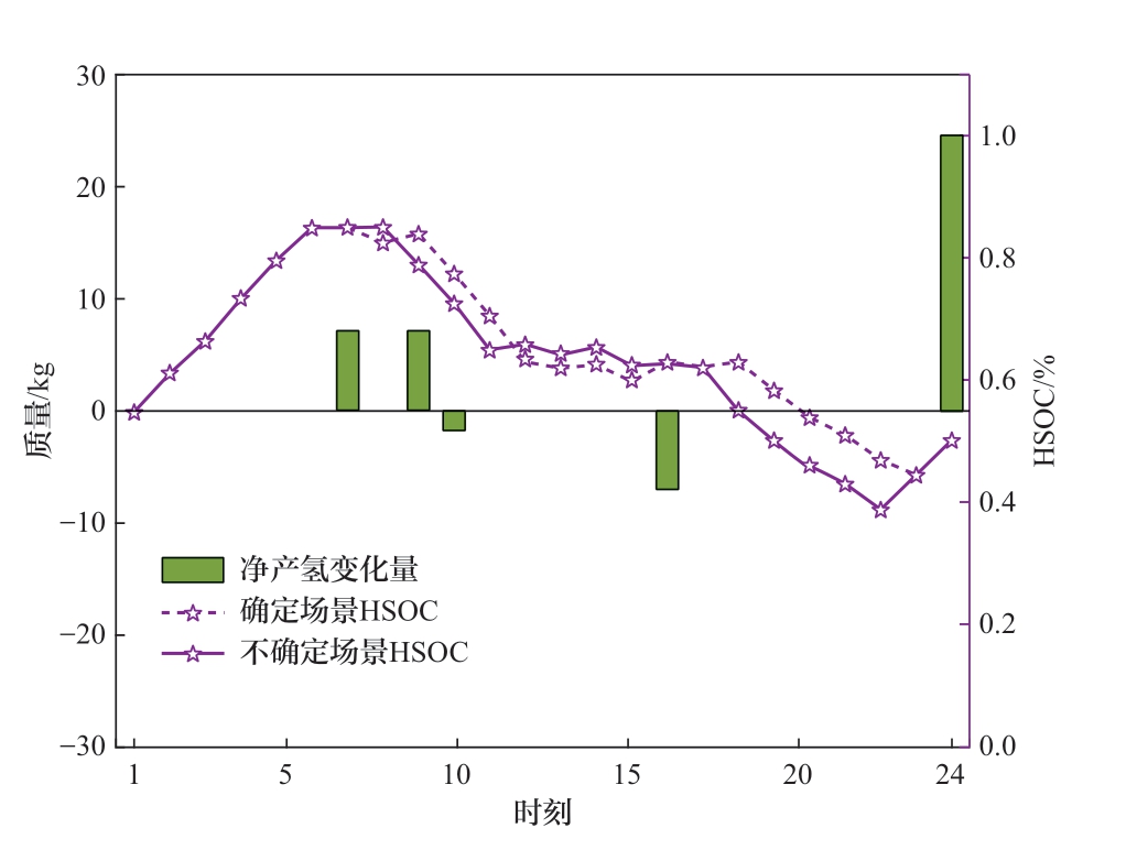 本节将IES的购能计划和充放电计划以及HRS的购能计划与确定性场景进行比较,对比如图9—图12所示,变化量都是考虑不确定性场景与确定场景相应指标之差。IES可以利用直接购气、电和充放电来缓解因源荷波动引起的电力失配问题。由表3可知,与确定性方案相比,系统的电力采购和天然气采购分别增加了1088 kW和474 m3,充电量增加了106.14 kW,放电量增加了95.79 kW,且由图10可知储能系统的SOC变化相较确定场景更加频繁,进一步提高了能源调度计划的保守性。与确定性情景相比,HRS为应对氢负荷的波动,采用了较为保守的购能策略,增加了800 kW的与IES电能交互进行制氢囤积,净产氢增加了24.7 kg,并且由图11可知,在考虑不确定性的情况,HRS增多了在低电价时的购电量,减少了在高电价时的购电量,由图12可知,在考虑不确定性的情况下,HRS会在低电价的时刻增加制氢量使HSOC较确定场景提前达到峰值。