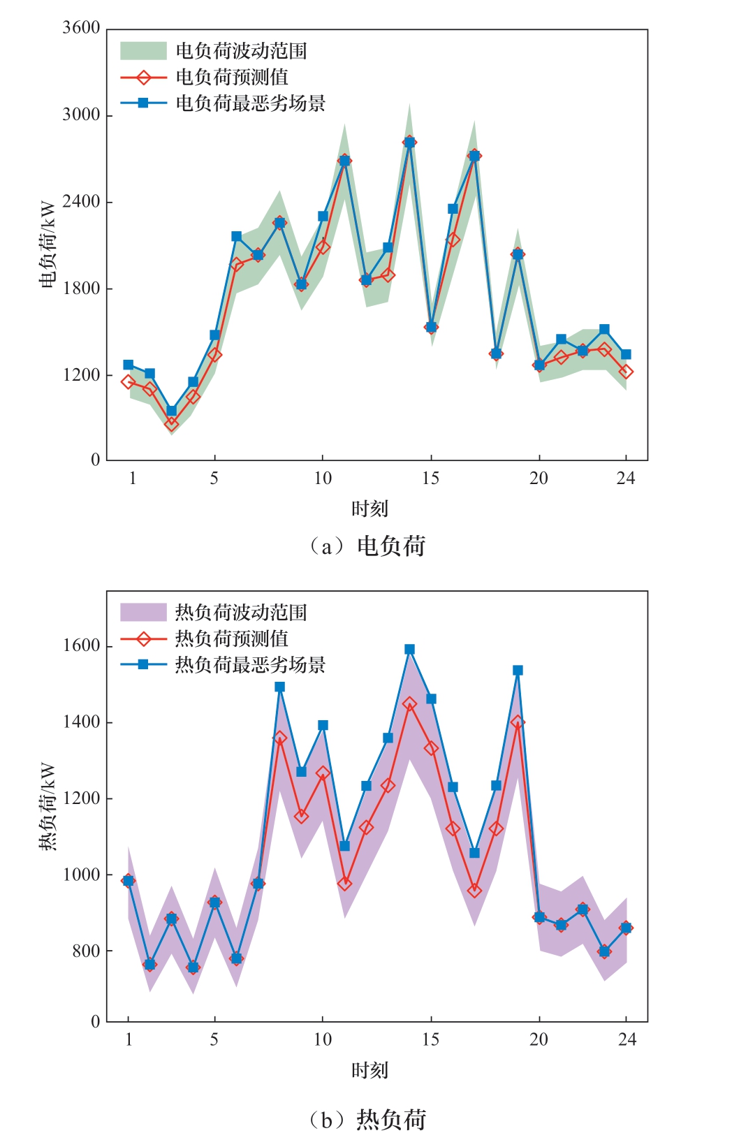 式中:UPV、UWT、Uload,e、Uload,h分别表示光伏出力、风电出力、电负荷、热负荷的不确定性集合;ΓPV、ΓWT、Γload,e、Γload,h分别为光伏出力、风电出力、电负荷、热负荷鲁棒系数。