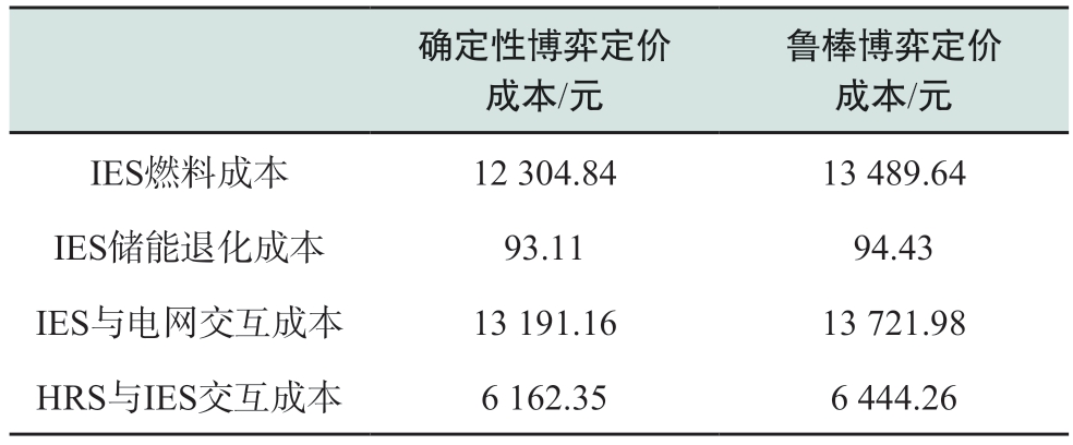 1) 本文所提考虑多重不确定性的定价策略,实现了IES与HRS成本最小化的双赢。此外,本文所提鲁棒博弈定价策略在兼顾风险规避的同时,还低于电网的分时定价,进一步降低了HRS的购能成本,增加了IES的售电收益。