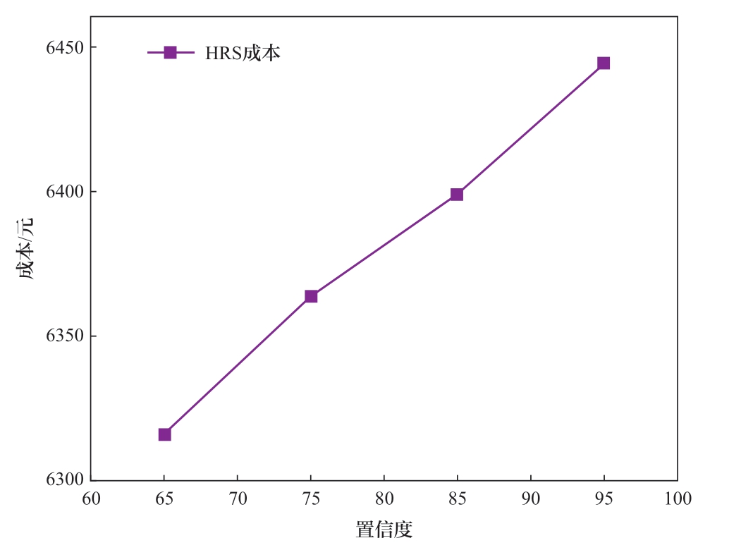 采用多工况仿真方法对源荷不确定性的鲁棒参数和储氢罐储氢量约束的置信水平进行了敏感性分析。鲁棒参数Γ的值越大,决策的保守性越强。为分析可再生能源出力和负荷的不确定性对运行优化的影响,将不确定性水平分别设置为0、4、8、12[20],模拟不同的风光出力和负荷变动对系统运行的影响。不同的鲁棒参数相应的运行成本见表4,从中可以看出,运行成本与不确定比呈正相关。这反映了不确定参数对鲁棒调度计划的影响。当鲁棒参数为0时,与确定性优化结果相对应,系统成本最低,但这种高回报伴随着高风险。随着不确定比率的增加,由于考虑更多不确定的时间段,成本继续上升。系统更多的外部交互提高了能源供应的可靠性。当鲁棒系数为12时,风险较小,但运行成本较高。由此可见,实现低风险需要大量的投资。实际中鲁棒系数的制定可以根据当时运行中对风险偏好的程度进行选择。在HRS分布鲁棒机会约束优化中,置信度是模型的核心参数,其变化直接影响模型的鲁棒性和经济性。为分析储氢罐储氢量约束的置信水平对HRS成本的影响,将置信度分布设置为65、75、85、95[33]。由图13可知,随着置信度的提高会导致解的保守性增强以及经济性下降。当置信度为95时,系统能够在需求波动最坏情况下仍满足约束,但牺牲了一定的经济性,模型需购入更多电力制备氢气应对不确定性,导致总成本上升;反之,当置信度降低时,解的保守性降低,购买电力减少,总成本下降。