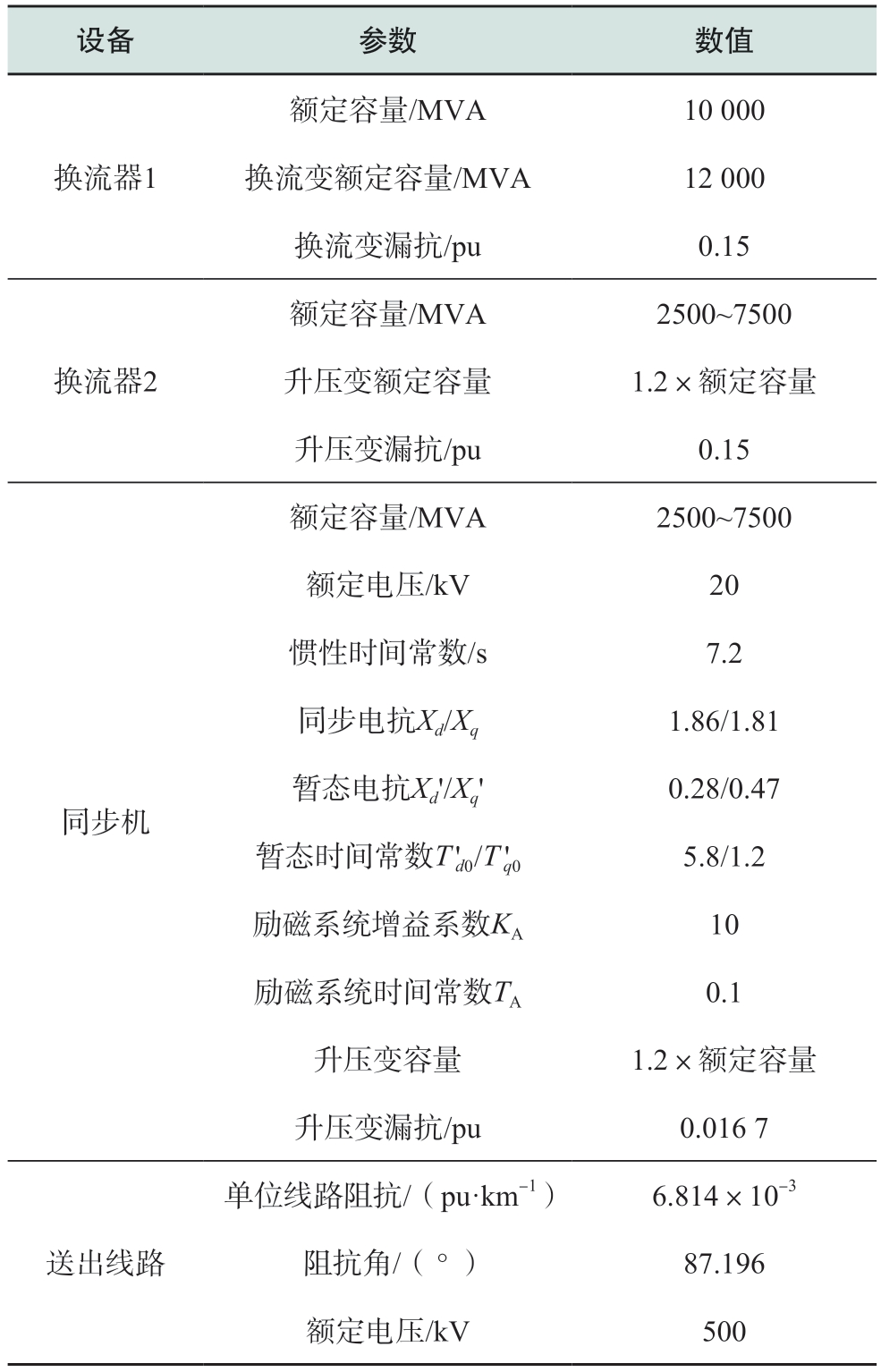 2)送端新能源基地电网的暂态稳定性主要表现在送端新能源基地3个电源(即送端换流站、新能源基地的非同步机电源和同步机电源)之间的同步稳定性。由于送端换流站确立了送端新能源基地电网的额定频率运行条件,送端新能源基地3个电源之间的同步稳定性就表现为新能源基地的非同步机电源保持额定频率运行的能力以及同步机电源保持额定频率运行的能力。因此本文在暂态稳定性分析中,主要考察新能源基地的非同步机电源和同步机电源在大扰动下回到额定频率运行的能力。