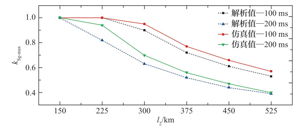 基于图2所示的等值电路图,利用4.3节所提出的同步机容量占比评估方法,在不同期望CCT、不同送出线路长度下,对能使系统保持同步稳定的同步机最大容量比例kSg-max进行数值计算。其中,同步机与换流器2均满发,换流器2无功指令值为0;采用三回线输出的线路2等效为单回路;故障为三相金属性接地故障,且发生于换流器1的交流侧出口。系统其他主要参数如表1所示。