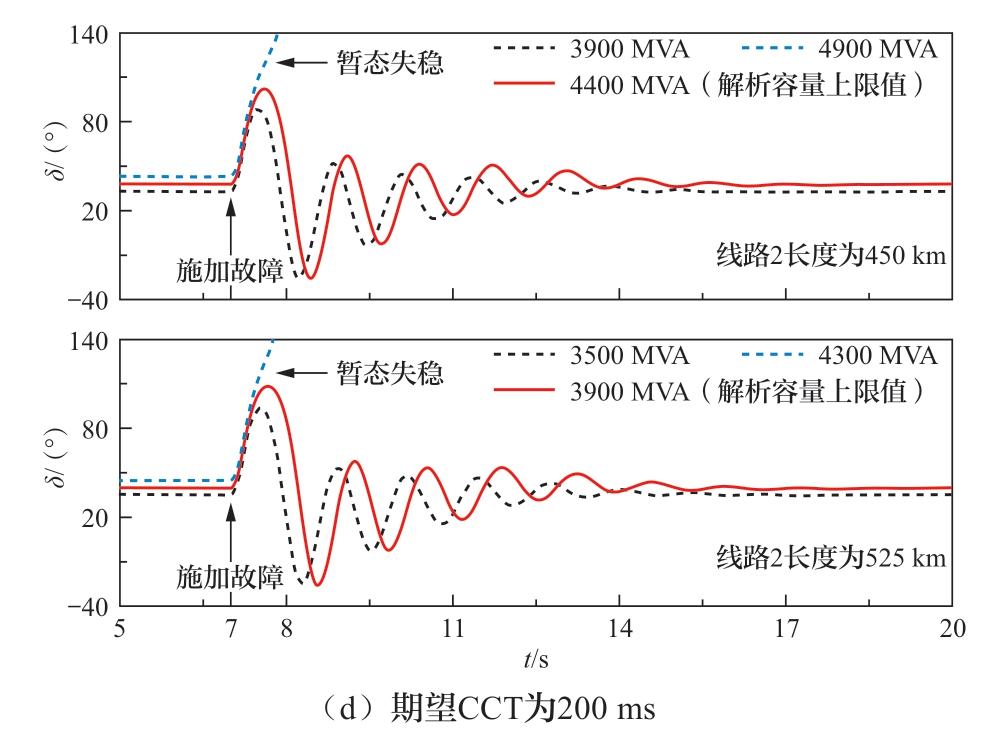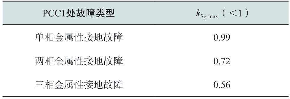 以故障清除时间(critical clearing time,CCT)为量化指标时,kSg应当使系统任意点发生故障时的CCT不小于所期望的CCT值,即:系统最严重故障下的CCT为期望的CCT时,基于式(8)得到的对应kSg即为该期望CCT下最大的同步机容量占比。根据式(6),当换流站1在限流模式下的电流相角φ1有利于同步机的稳定性时,对同步机而言,线路1与线路2上的最严重故障均位于送端换流站的交流侧出口。因此,送端换流站的交流侧出口发生三相金属性接地故障时,使系统CCT为期望CCT值的kSg即为最大的同步机容量比例。