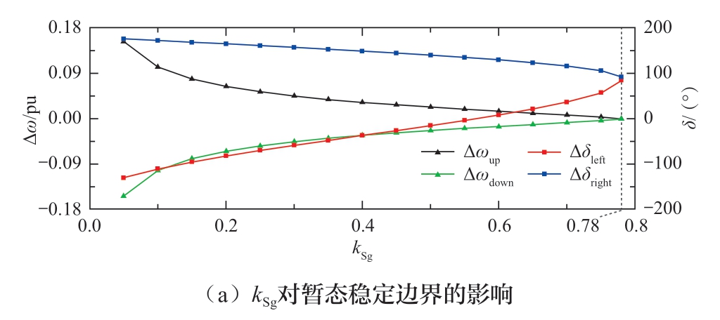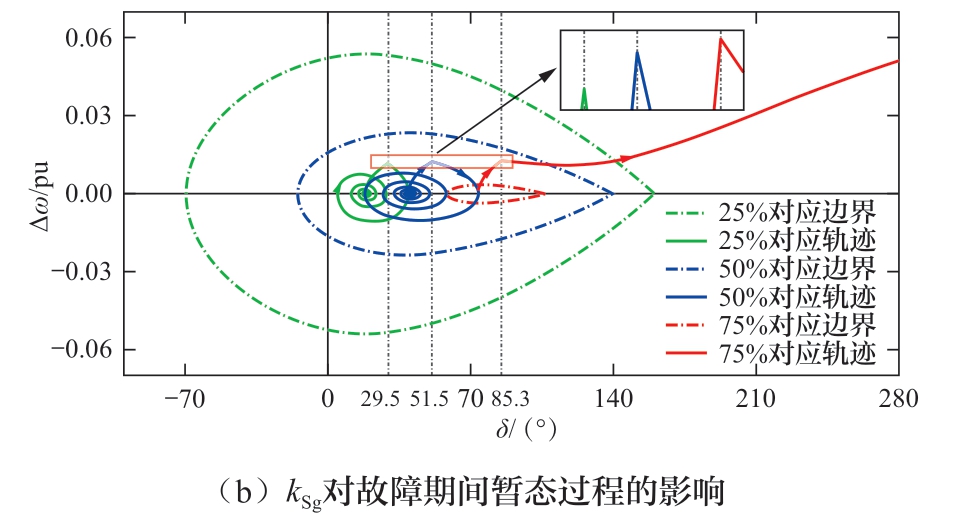AAi与ABi均不随kSg的变化而变化,因此kSg对故障态下的Pegi无影响。但增大kSg会同时增大Pmg,在Pegi无变化的情况下,同步机的净转矩将增大,V的轨迹到达稳定边界Vcr的时间(也即故障清除时间)将缩短,因此kSg增大将恶化同步机的暂态特性。