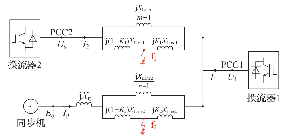 其中:XLine1、XLine2分别表示线路1、线路2中每回输电线路的阻抗;Ki用于描述故障i的发生位置fi,当Ki越接近于0时,线路i上的故障点fi离换流器1越近,i=1或2,且满足Ki∈(0,1)。