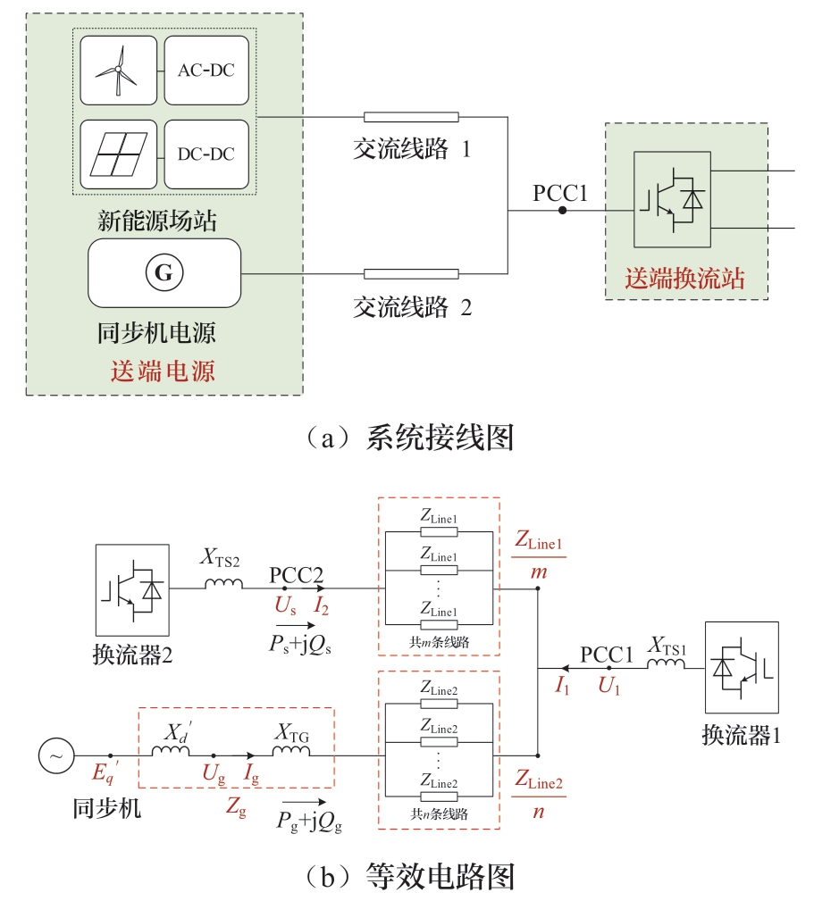 本文以图1所示的新能源联合同步机电源经柔性直流送出系统的送端交流系统为研究对象。其中,新能源基地、同步机电源分别经交流线路1、交流线路2连接至送端换流站交流母线PCC1处。