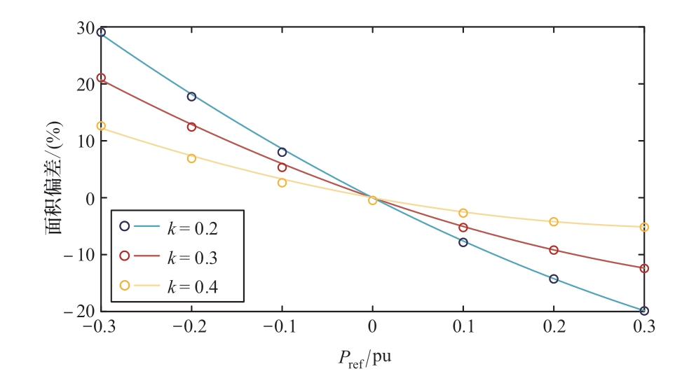 继续沿用表1参数,绘制在不同的Pref及k值下,机组非线性模型及小信号模型稳定域面积差异百分比ΔS的变化情况,结果如图13所示。由图可知,在不同的k值下二者面积差异均呈现如式(15)所示的抛物线关系,即当功率指令下调时,小信号模型稳定域计算结果偏保守,而当功率指令上调时,小信号模型计算结果偏乐观。此外,随着k值的增加,二者面积的差异逐步减小,即小信号模型更适用于宽转速范围的I型全功率变速抽蓄机组的稳定性分析中。