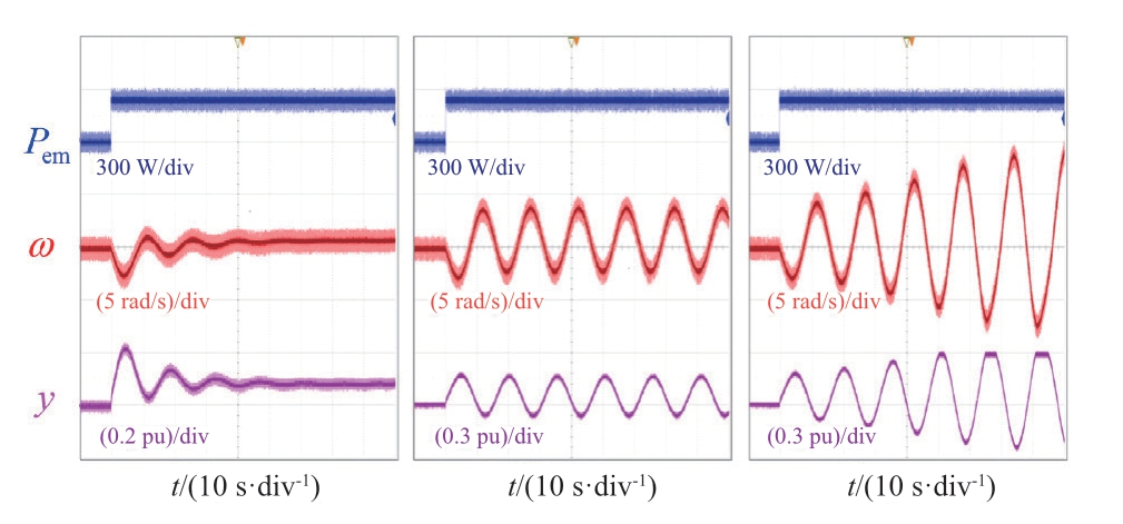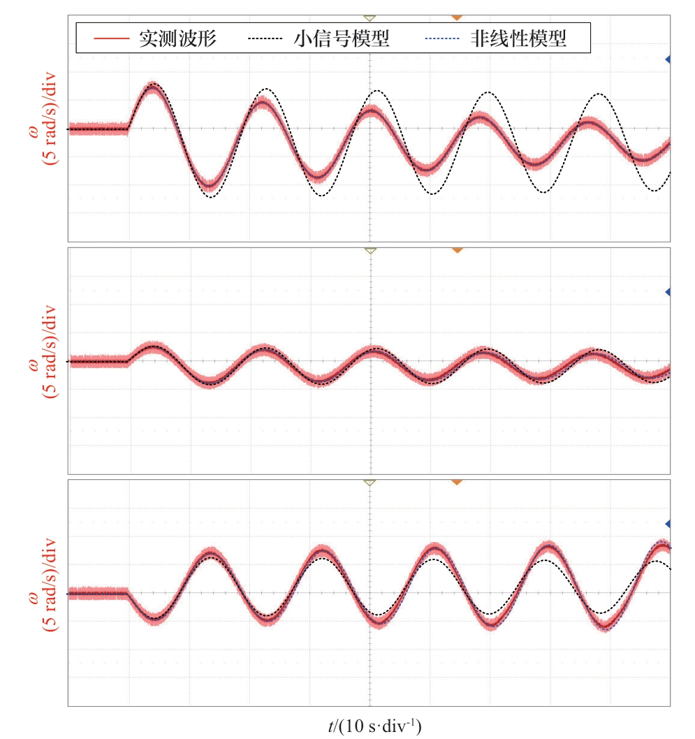 在图14中选取D、E、F 3点,取kpg=2.5,kig=0.35,同样基于图9所示实验平台,对比采用SSM及NLM时所得机组转速变化情况与实测波形的偏差程度,结果如图15所示。由图可知,D所在区域中小信号模型对机组稳定性的估计过于保守,F所在区域则会将不稳定的控制参数配合误判为稳定,E所在区域则能在做到不过于保守的同时防止不稳定参数组合的误判,这验证了图14所划分出的小信号模型适用范围的准确性。