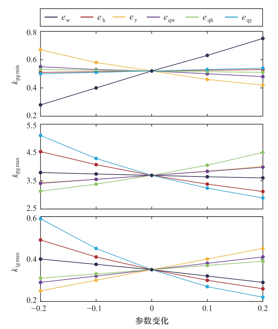 稳定域面积的变化率可以衡量各参数对机组稳定域整体的作用效果,而稳定域边界曲线的具体形态则可以进一步反映各参数对稳定性的影响。此处以Pref=0.05为例,选用稳定域边界曲线与横轴的交点坐标kpgmax、kpgmin及kig能取到的最大值kigmax,结果如图12所示。由图可知,kpgmin主要受ew与ey影响,这是便于由图4直观理解的:由于图4中C点位置受调速器初期动作速度与水泵水轮机等开度线的倾斜程度共同影响,绝对值较大的ew(ew一般为负值)对应倾斜程度较高的等开度线,因而此时较慢的导叶动作速度也能使机组稳定,而较大的ey代表机械转矩对导叶的变化更为灵敏,因此无需较大的kpg也能达到同样的机械转矩输出效果。而相比之下kpgmax与kigmax的影响因素更为复杂,与水泵水轮机6个传递系数均有一定关联,其中,eh与eqy对二者的影响均相对较大。
