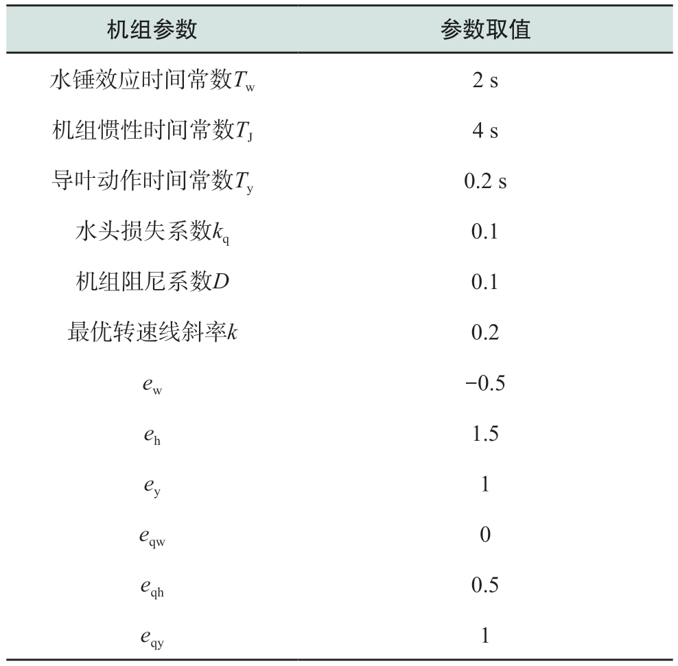 机组参数 参数取值水锤效应时间常数Tw 2 s机组惯性时间常数TJ 4 s导叶动作时间常数Ty 0.2 s水头损失系数kq 0.1机组阻尼系数D 0.1最优转速线斜率k 0.2 ew -0.5 eh 1.5 ey 1 eqw 0 eqh 0.5 eqy 1