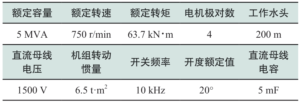 额定容量 额定转速 额定转矩 电机极对数 工作水头5 MVA 750 r/min 63.7 kN·m 4 200 m直流母线电压机组转动惯量 开关频率 开度额定值 直流母线电容1500 V 6.5 t·m2 10 kHz 20° 5 mF