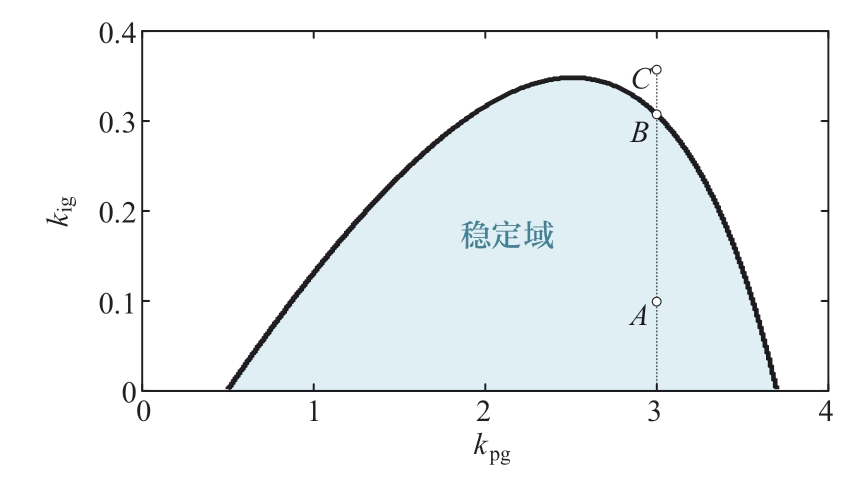 以春厂坝全功率变速抽蓄机组[7]为例,其关键参数如表1所示。以kpg为自变量,kig为分岔参数,在改变kpg时计算分岔发生时的kig值如图6所示,曲线与坐标轴围成的蓝色区域即为机组调速系统的稳定域。