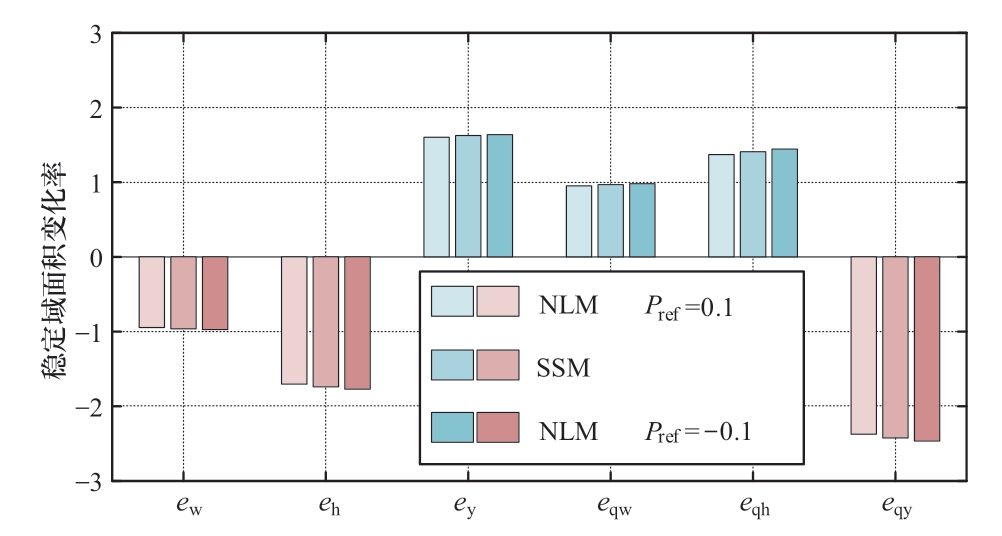 首先分析水泵水轮机6个传递系数对系统稳定性的影响,在表1所示参数的基础上,分别使各传递系数增加0.1,计算分别采用小信号模型(small signal model,SSM)以及不同功率指令下的非线性模型(non-linear model,NLM)时,机组稳定域面积的变化率,结果如图11所示。由图可知,机组稳定域与ew、eh及eqy成负相关,与eh、ey及eqw成正相关,且受eqy的影响最为显著。此外,在功率指令上升时,非线性模型稳定域对各参数的灵敏度低于小信号模型,在功率指令下降时则相反。