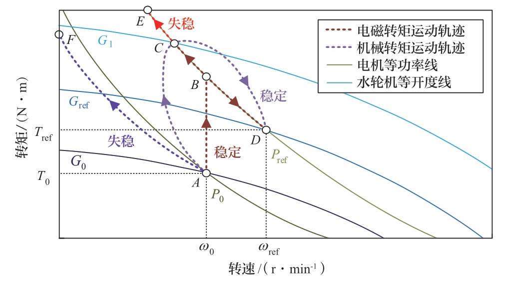 如图4所示,利用水泵水轮机的特性曲线及电机的等功率线,以机组功率指令上升为例论述机组潜在的转速失稳风险。出力调节前机组稳定运行于A点,某一时刻功率指令从P0跃升至Pref,此后变流器快速动作将电磁转矩提升至Pref对应的等功率线上,即B点所在位置。此时制动性质的电磁转矩大于驱动形式的机械转矩,因此机组沿等功率线开始减速。然而,由于电机恒功率控制要求转速与电磁转矩的乘积一定,机组减速过程中电磁转矩反倒上升,进一步加剧了减速的趋势,以此类推形成了潜在的正反馈过程。若调速器动作及时,即机械转矩沿AC变化,则在C点处机组停止减速。随后在调速器控制机组,电磁转矩沿等功率线经CBD达到D点,完成出力的调节。而若调速器不能及时动作,则由于正反馈的存在,转速将一直下跌直至机组失稳,如图中曲线BE、AF所示。