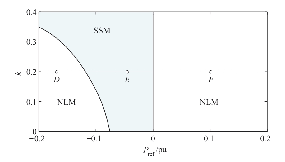 与小信号模型不同的是,非线性模型的稳定域与稳定点S的位置有关。而S仅与功率指令及k有关。因此Pref与k的取值是小信号模型与非线性模型之间差异的重要影响因素。