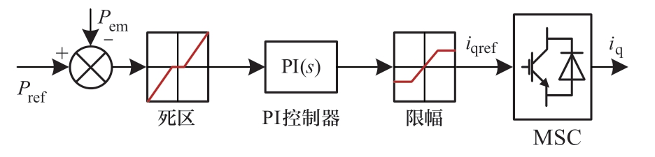 全功率变流器分为机侧及网侧2部分,其中机侧变流器通过开关管的动作调节机组电磁功率,而网侧变流器用于维持直流母线电压。基于前述简化假设,不考虑网侧变流器及电压外环动态特性的情况下,全功率变流器的控制框图如图3所示[24]。在标幺制下,iq与Tem有相等的数值,此外,机侧变流器可简化为时间常数为Tc的惯性环节,因此全功率变流器的状态方程如式(6)所示。