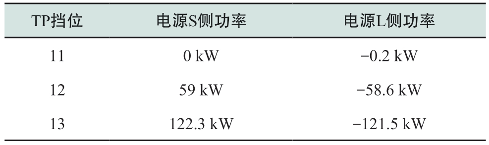 TP挡位 电源S侧功率 电源L侧功率11 0 kW -0.2 kW 12 59 kW -58.6 kW 13 122.3 kW -121.5 kW