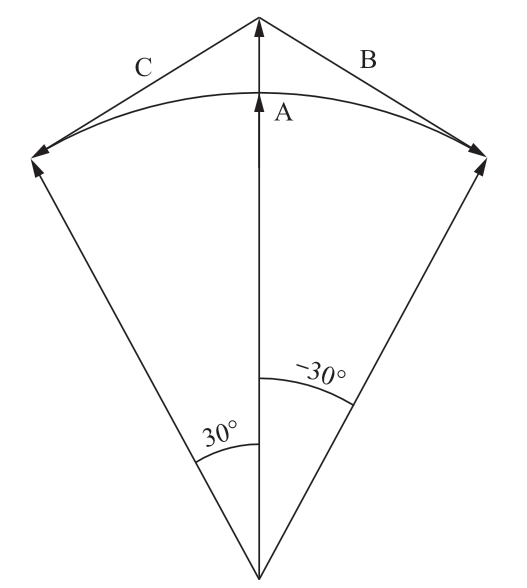 三相励磁绕组并联在三相线路的相线和中性点间,三相调压[13]绕组与调相[14]绕组串联接入对应线路中。通过调压、调相有载分接开关对三相调压、调相绕组的分接头进行选择,可改变串联在线路上的电压幅值及其相角,从而实现线路末端升、降电压自适应调节。移相变压器每相设置4个绕组,从铁芯到油箱依次是励磁绕组[15]、调相绕组1、调相绕组2、调压绕组。励磁绕组为整个移相变压器提供励磁,调压绕组的各分接头接到调压有载分接开关上。该有载分接开关带有正反转换选择器,采用正反调压方式。当调相绕组1与调相绕组2不串入时,可以通过调压有载分接开关调整输出电压幅值的增减,同时不改变电源电压的相角。调相绕组1与调相绕组2分别取自其他相绕组,分别接到两个调相有载开关上。同时调节调压开关与调相有载开关1时,可以调节相角的范围为0~+30°;同时调节调压开关与调相有载开关2时,可以调节相角的范围为0~-30°。这就是移相变压器的基本功能(电压调节及相角的调节)。调相矢量图如图3所示。