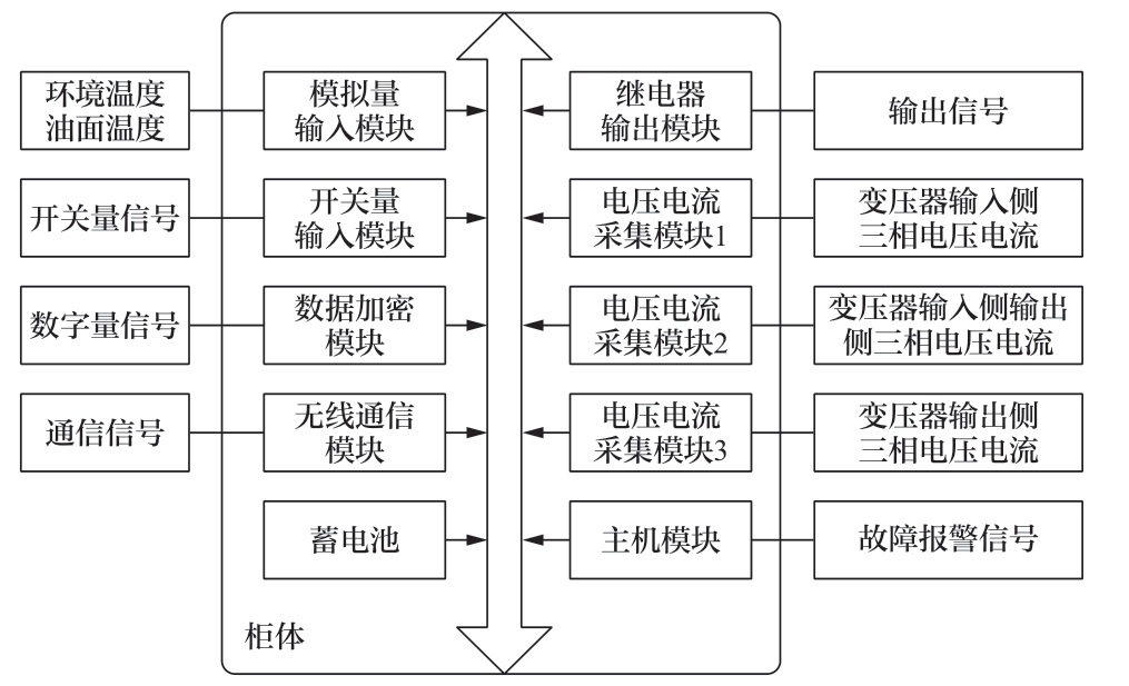 智能控制器的硬件全部采用模块化设计方案,主要包括主机模块、电压电流采集模块1、电压电流采集模块2、电压电流采集模块3、开关量输入模块、模拟量输入模块、继电器输出模块、无线通信模块、蓄电池模块、数据加密模块,如图5所示。